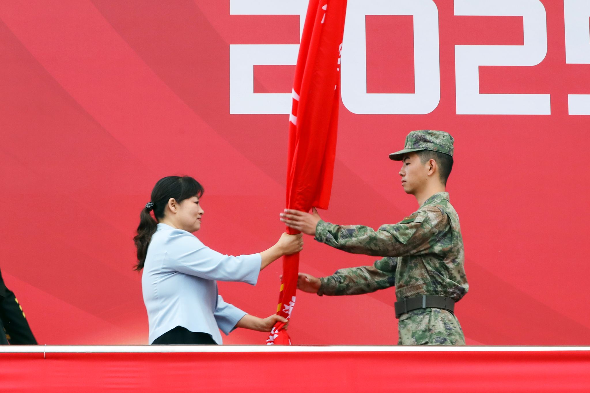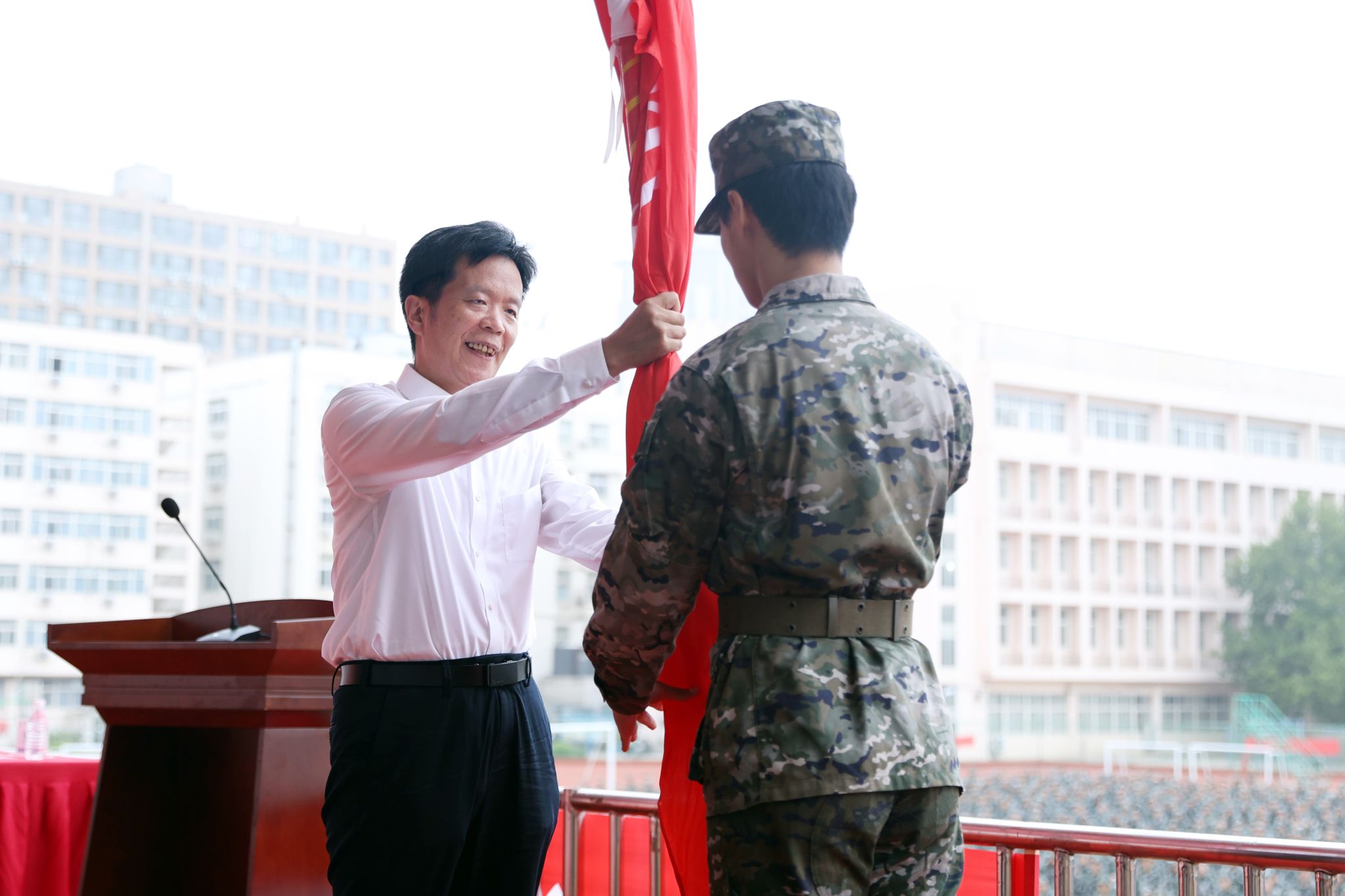 大会现场,李广慧、李志萍分别向两校区军训团授旗。
